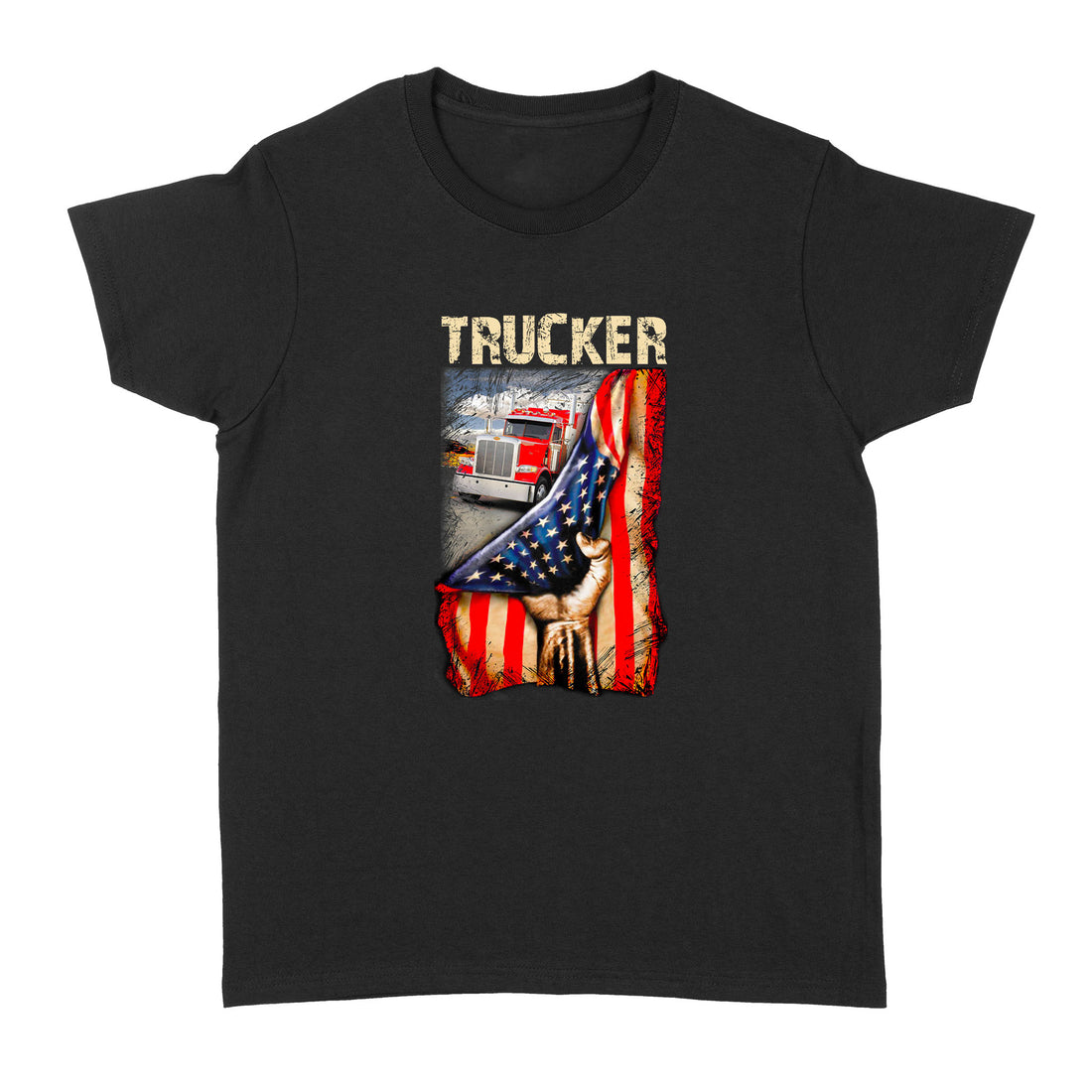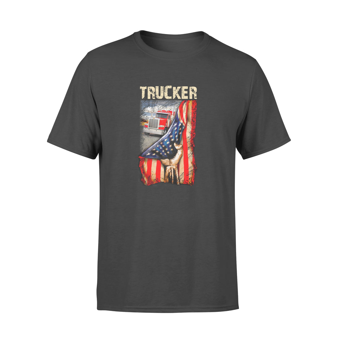 Truck Behind American Flag Trucker Love Graphic Tees Shirt Back - Premium T-shirt