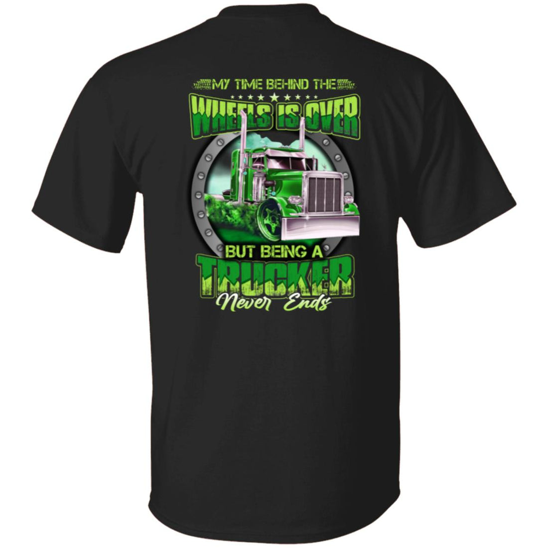 My Time Behind The Wheels is Over But Being A Trucker Never Ends Shirt Print On The Back