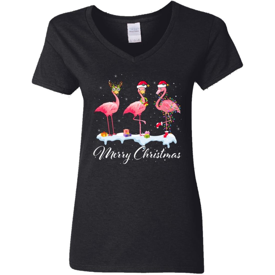 Merry Christmas Hat Santa Flamingo Light Snow Xmas Pajamas Shirt Women's V-Neck T-Shirt