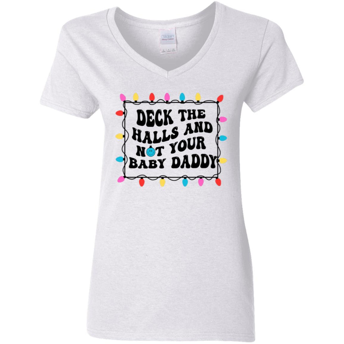 Deck The Halls And Not Your Baby Daddy Christmas Holiday Shirt - Funny Christmas T-Shirt Gift Women's V-Neck T-Shirt