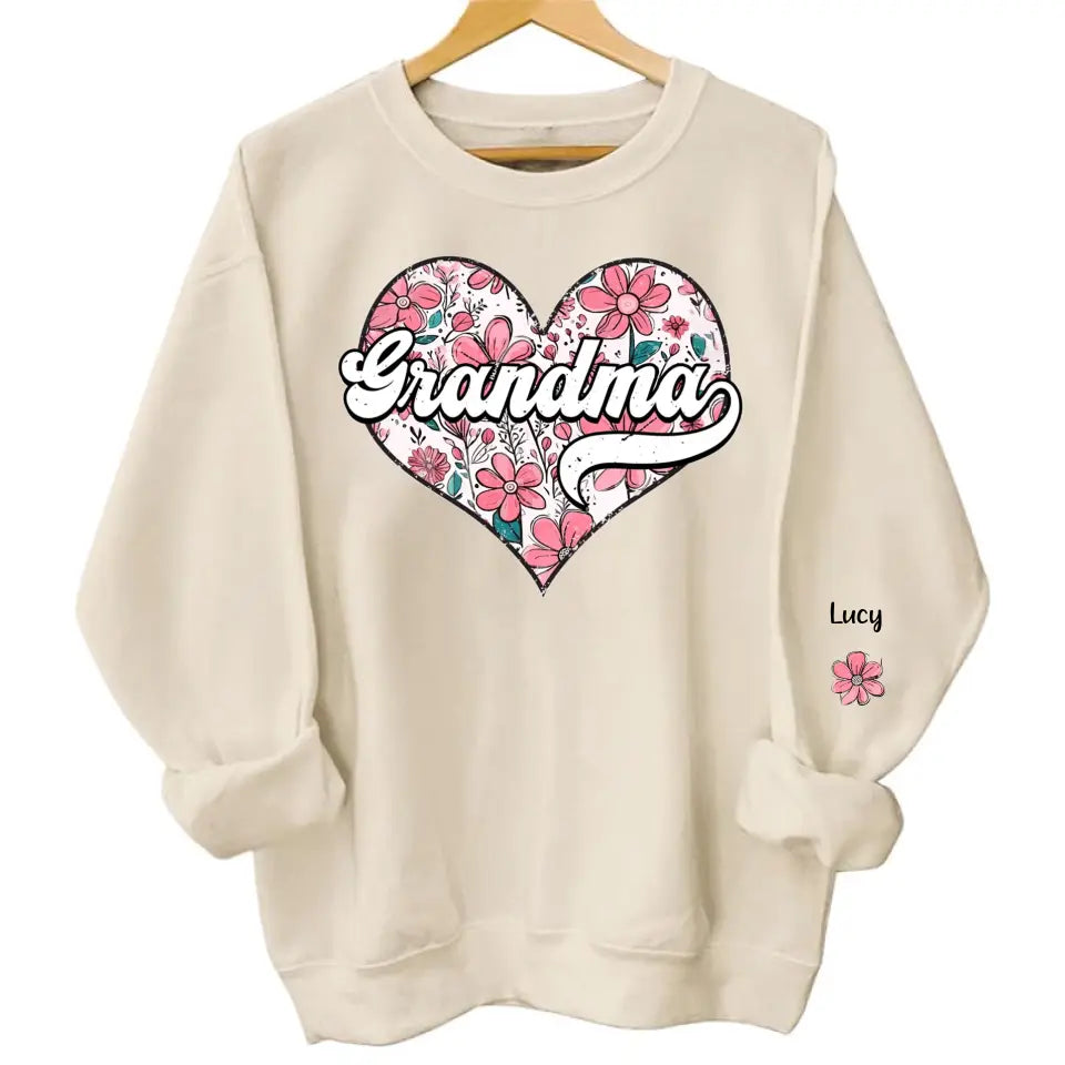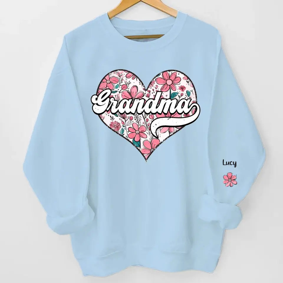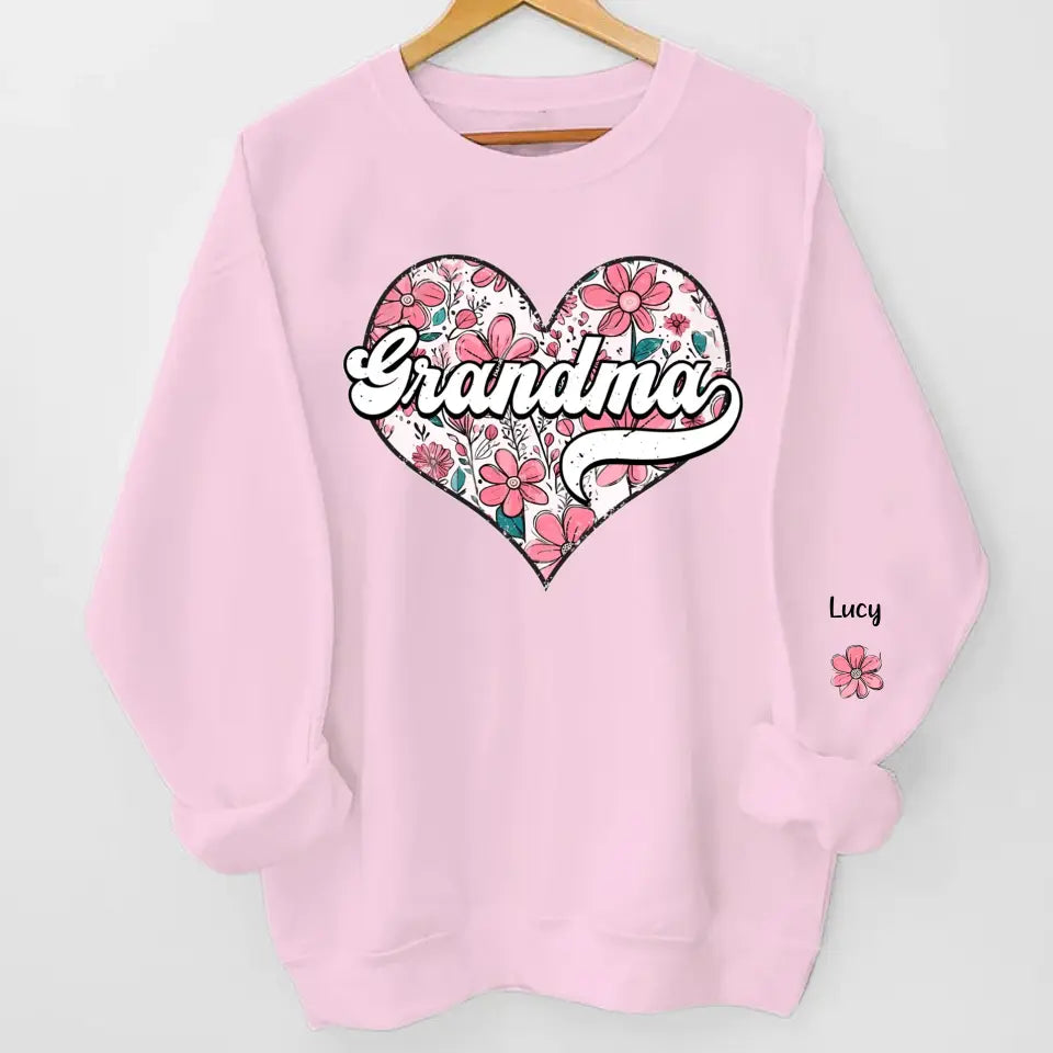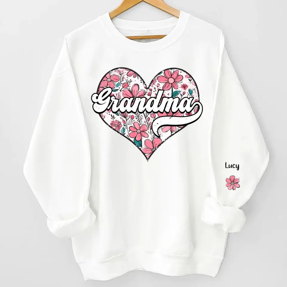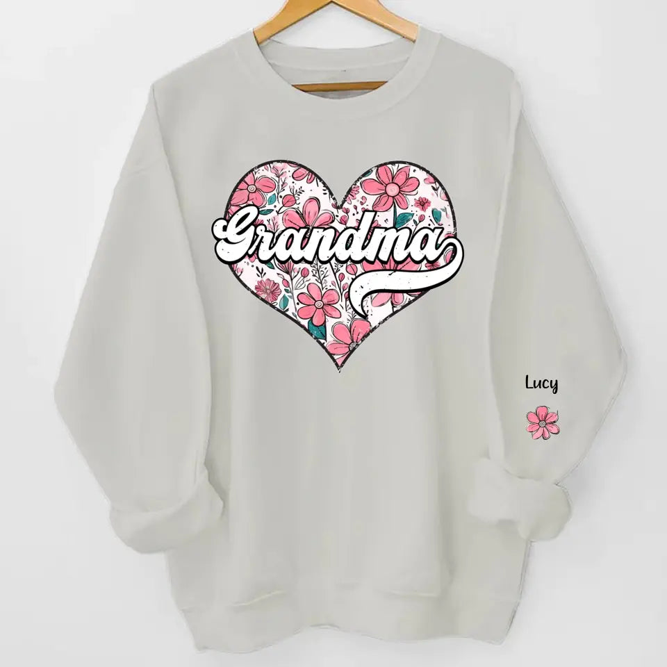 Flower Heart Grandma - Mama Personalized Sweatshirt with Design on Sleeve, Gift Gor Mom, Grandma
