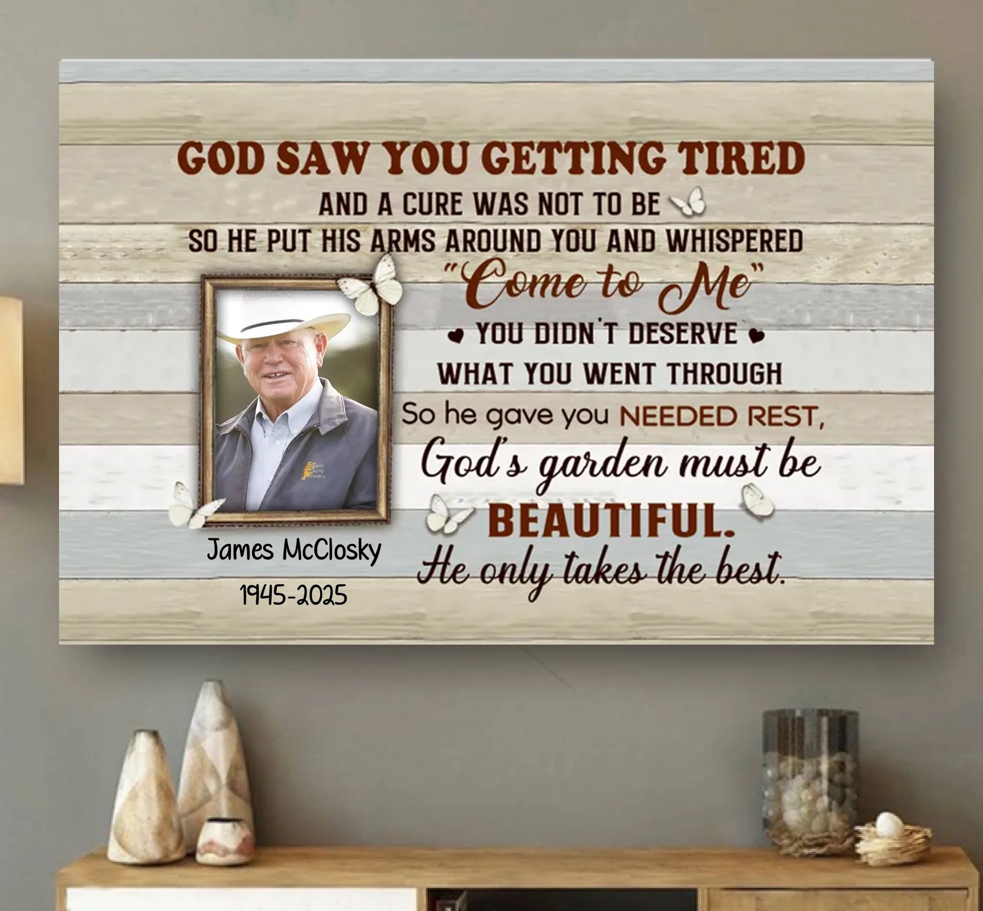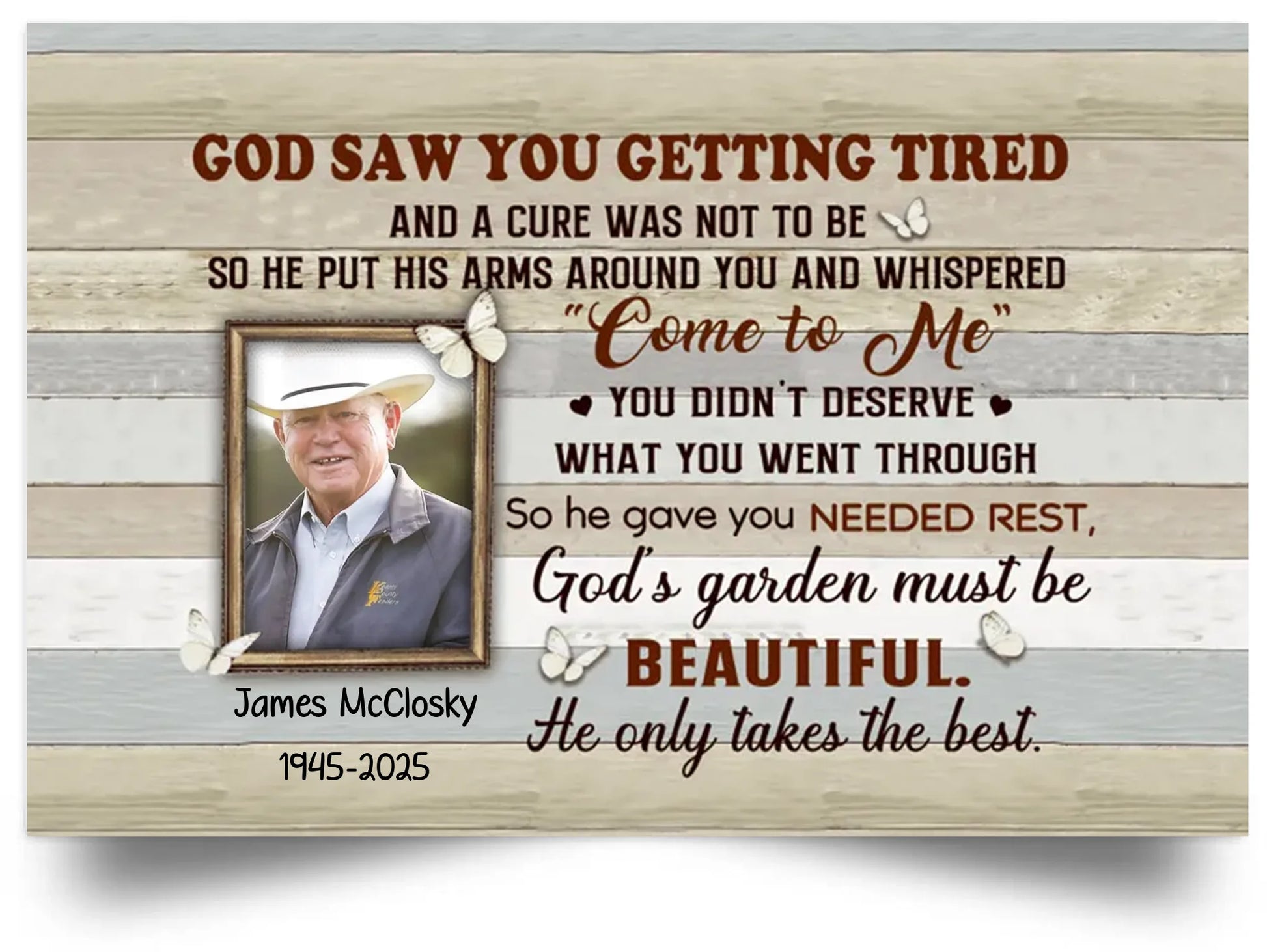 Honor your loved one’s memory with the "God Saw You Getting Tired" personalized canvas or poster. This memorial art allows you to upload a cherished photo, creating a heartfelt tribute that offers comfort and remembrance. Crafted with care, it serves as a lasting keepsake to celebrate a life well-lived and provide solace during difficult times.