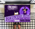 Haunted House Welcome Foolish Mortals Halloween Custom Personalized Witch Cat Doormat, Halloween Gift Idea For Cat Lover. Boasting life-like photographic image quality, this Doormat is composed of a polyester knit surface fabric and a natural black foam rubber backing. Ideal for indoor/outdoor light-duty areas as well as short term and promotional use.