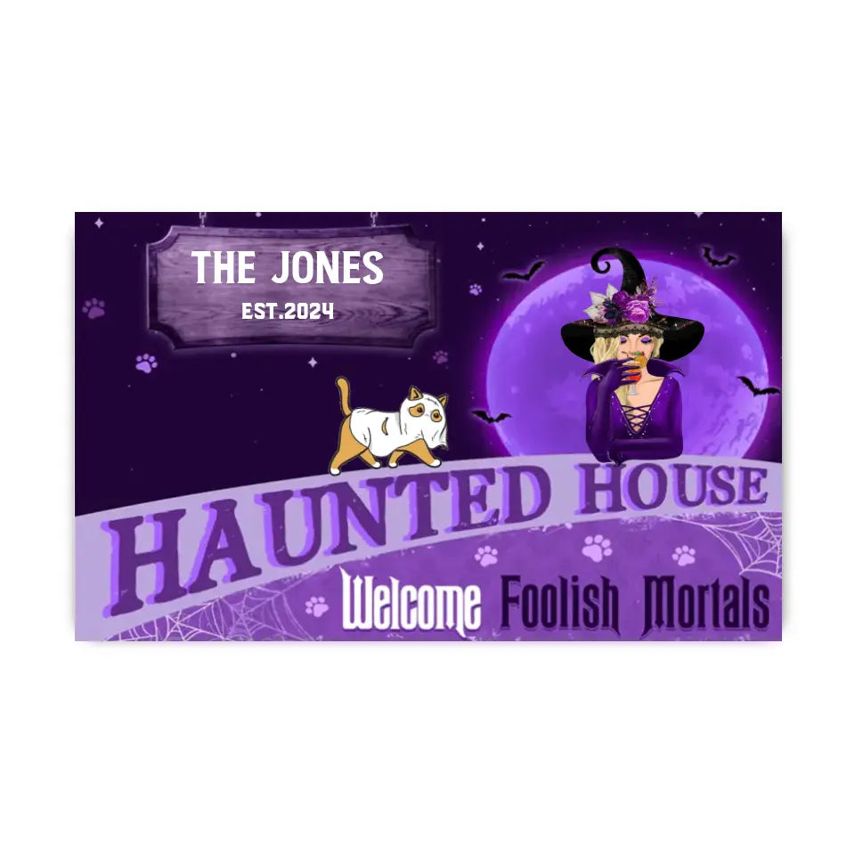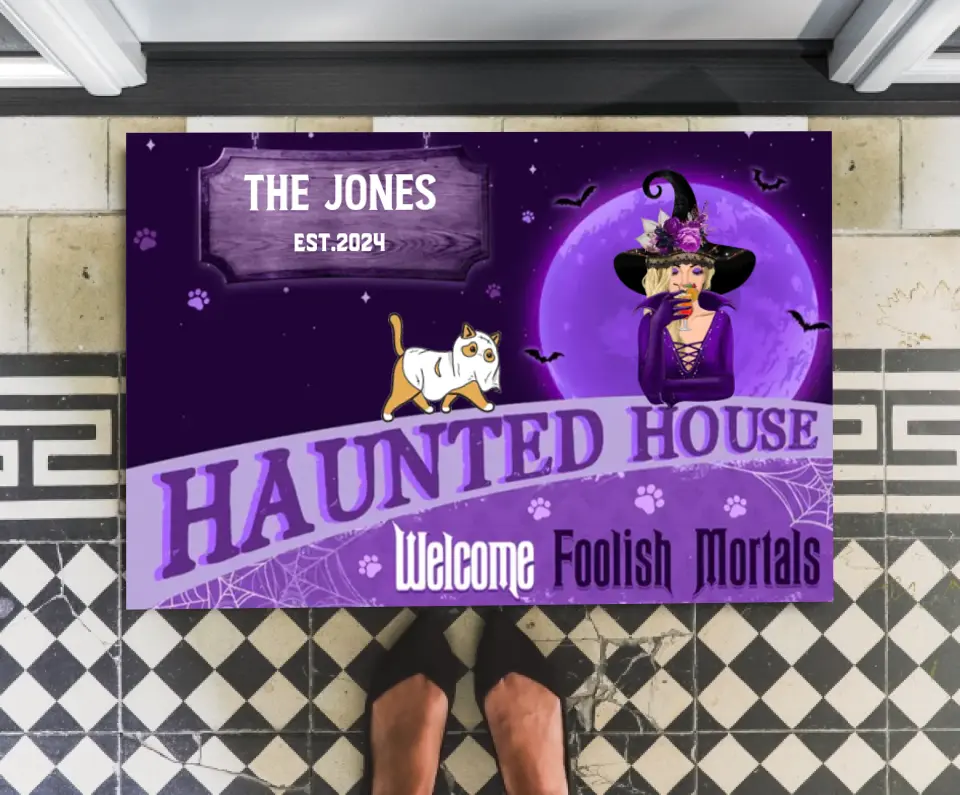 Haunted House Welcome Foolish Mortals Halloween Custom Personalized Witch Cat Doormat, Halloween Gift Idea For Cat Lover