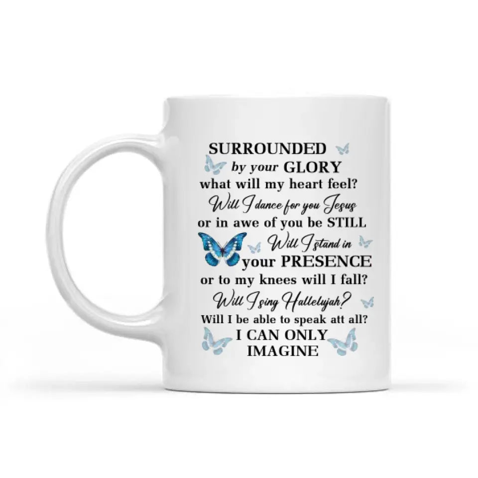 Experience the power of personalized inspiration with our I Can Only Imagine Mug. Featuring a custom name and the beloved lyrics 'Surrounded By Your Glory,' this mug is the perfect way to start your day with a reminder of God's love. Made for true coffee lovers.