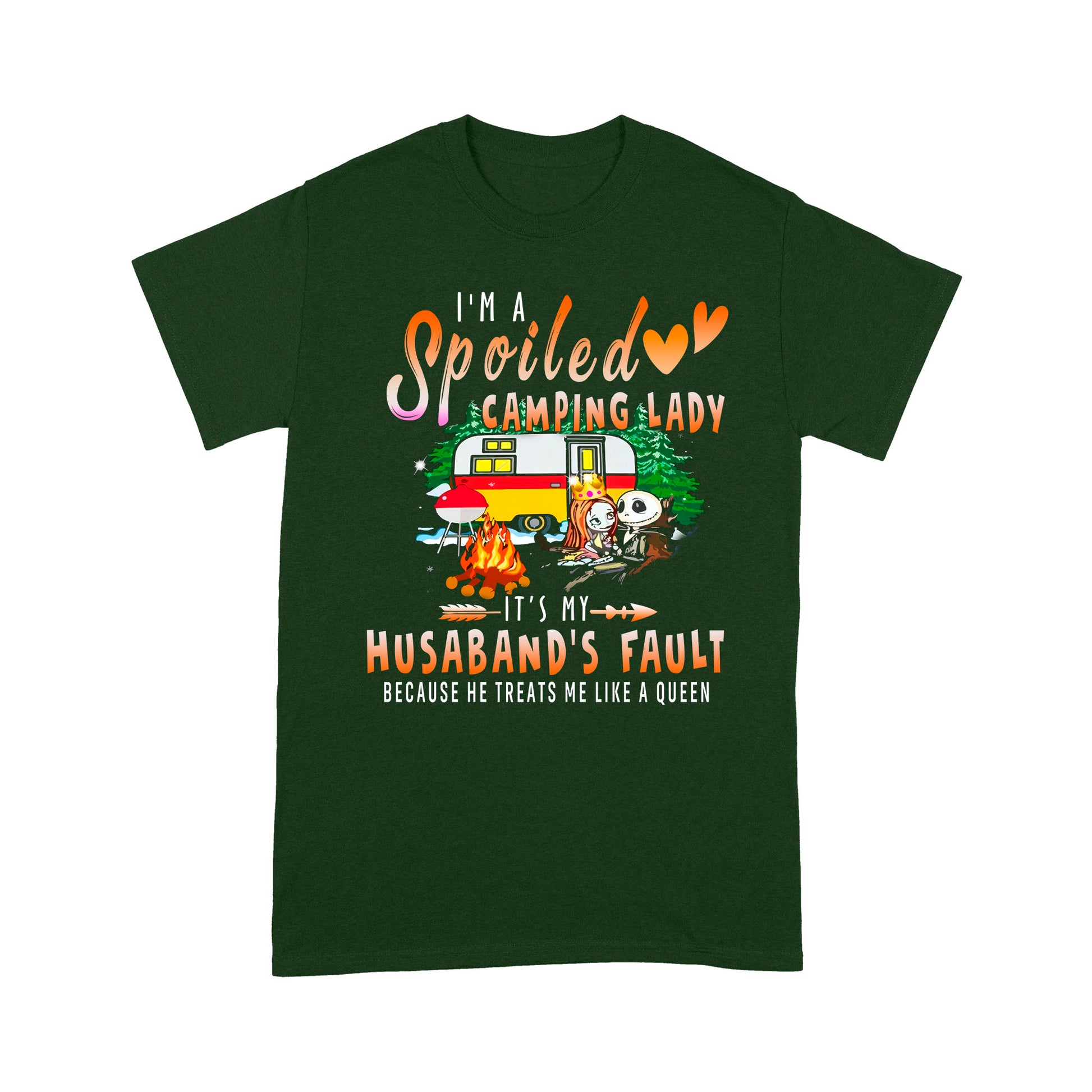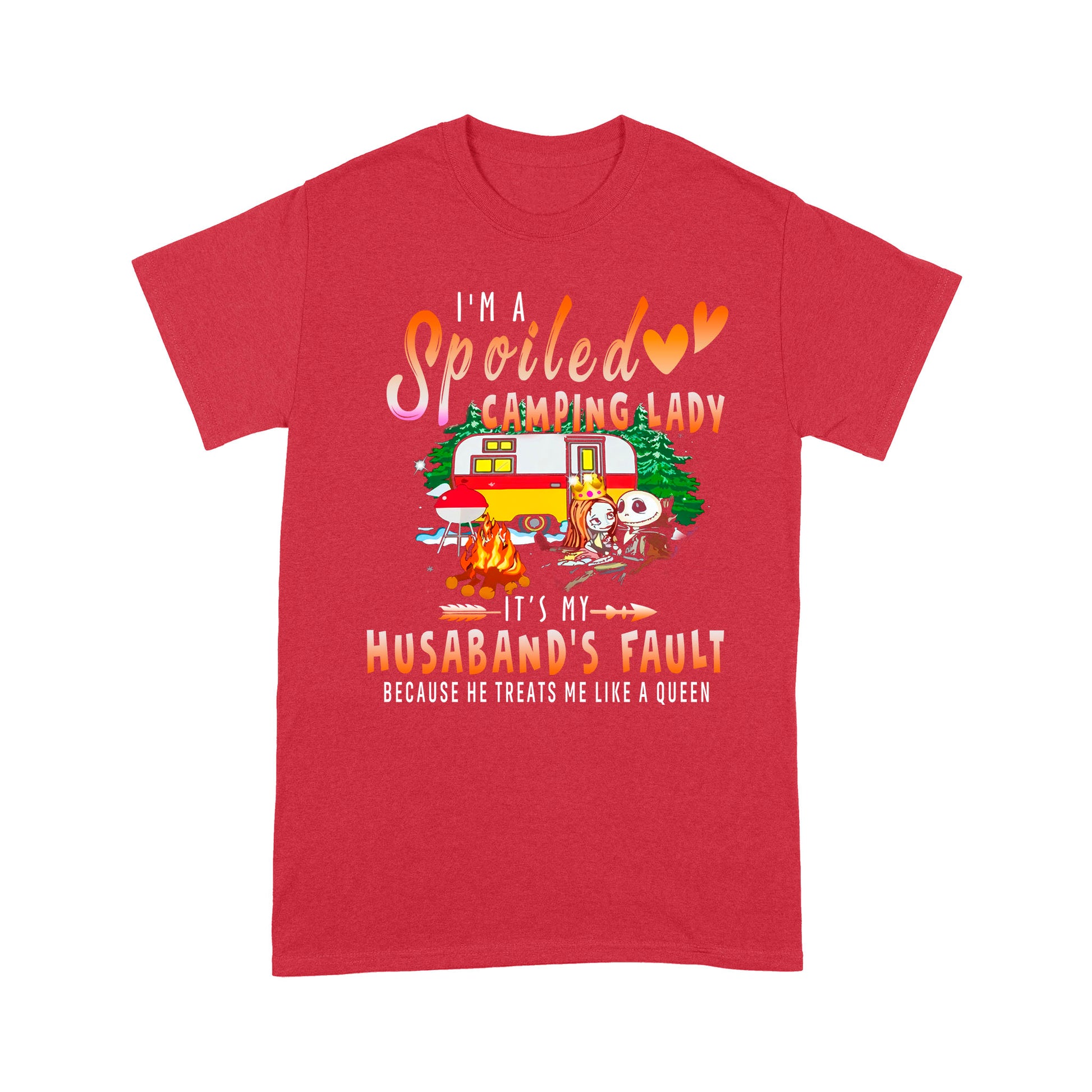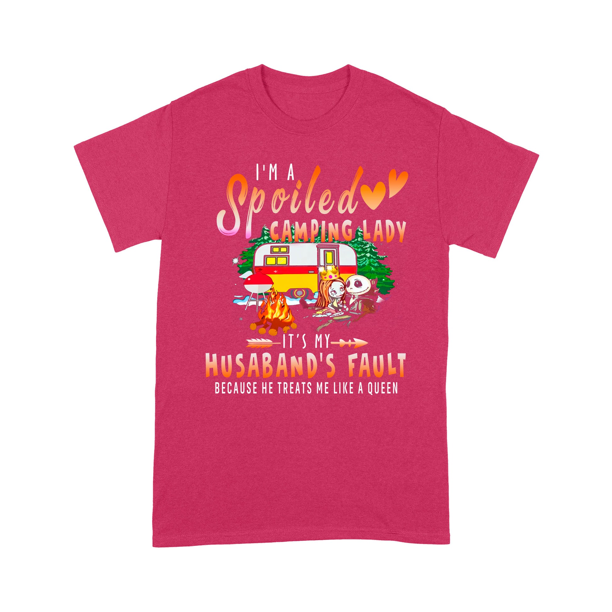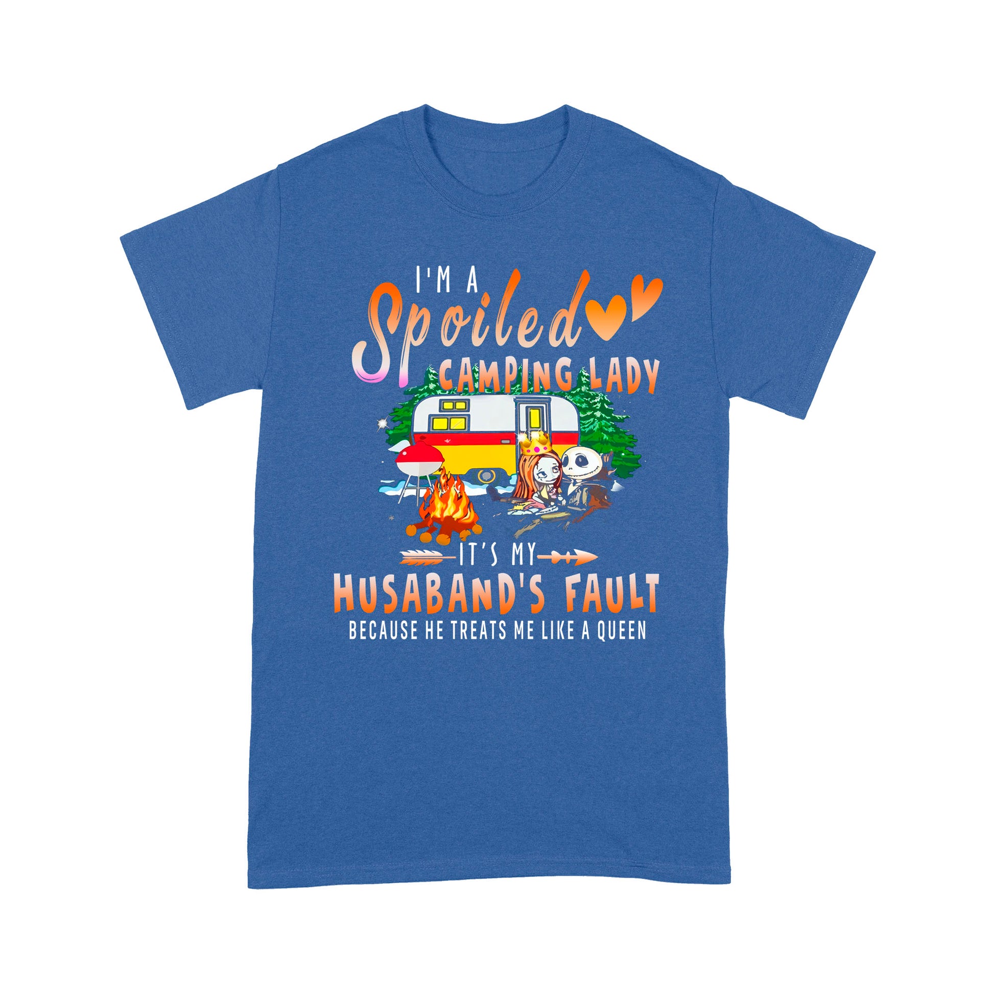 Jack skellington and sally I’m a spoiled camping lady it’s my Husband’s fault because he treats me like a queen shirt - Standard T-shirt.