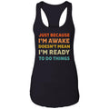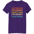 Just Because I'm Awake Doesn't Mean I'm Ready To Do Things T-Shirt. Perfect gift idea for Birthday, Party, Vacation or Any Occasion, Holidays, Halloween, Christmas…Designed, printed, and shipped from the United States.