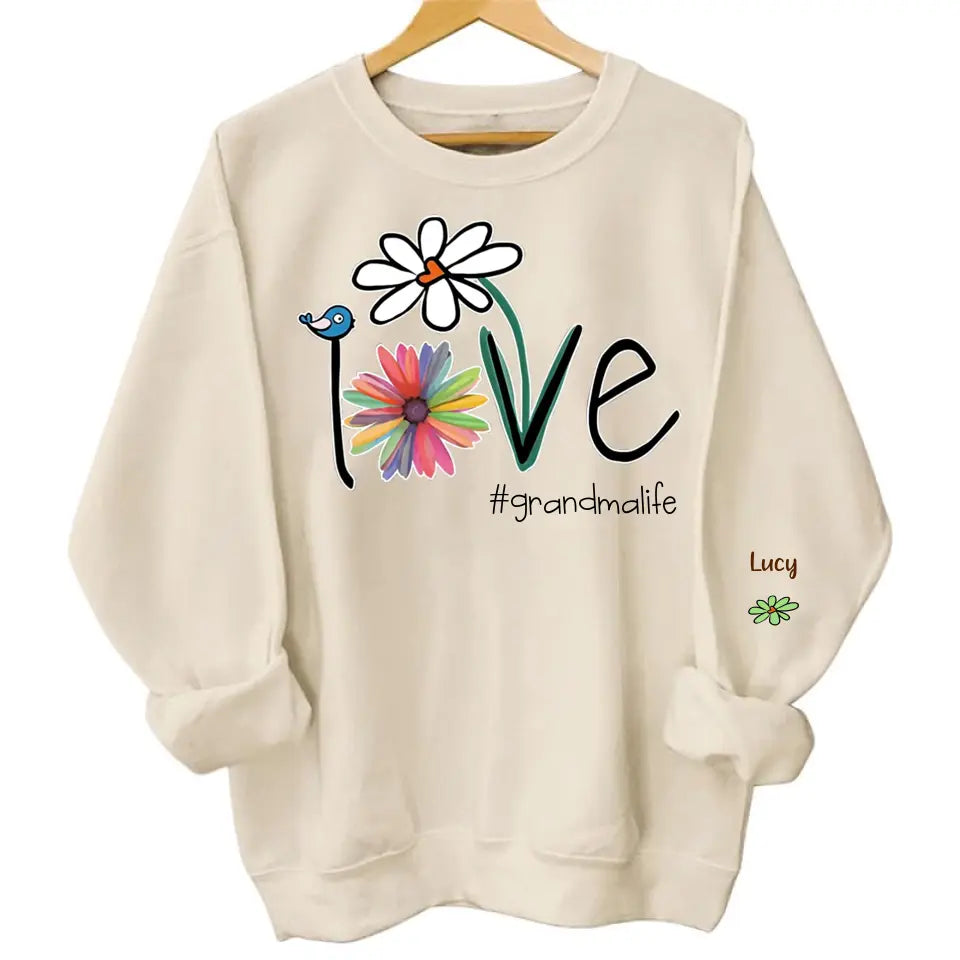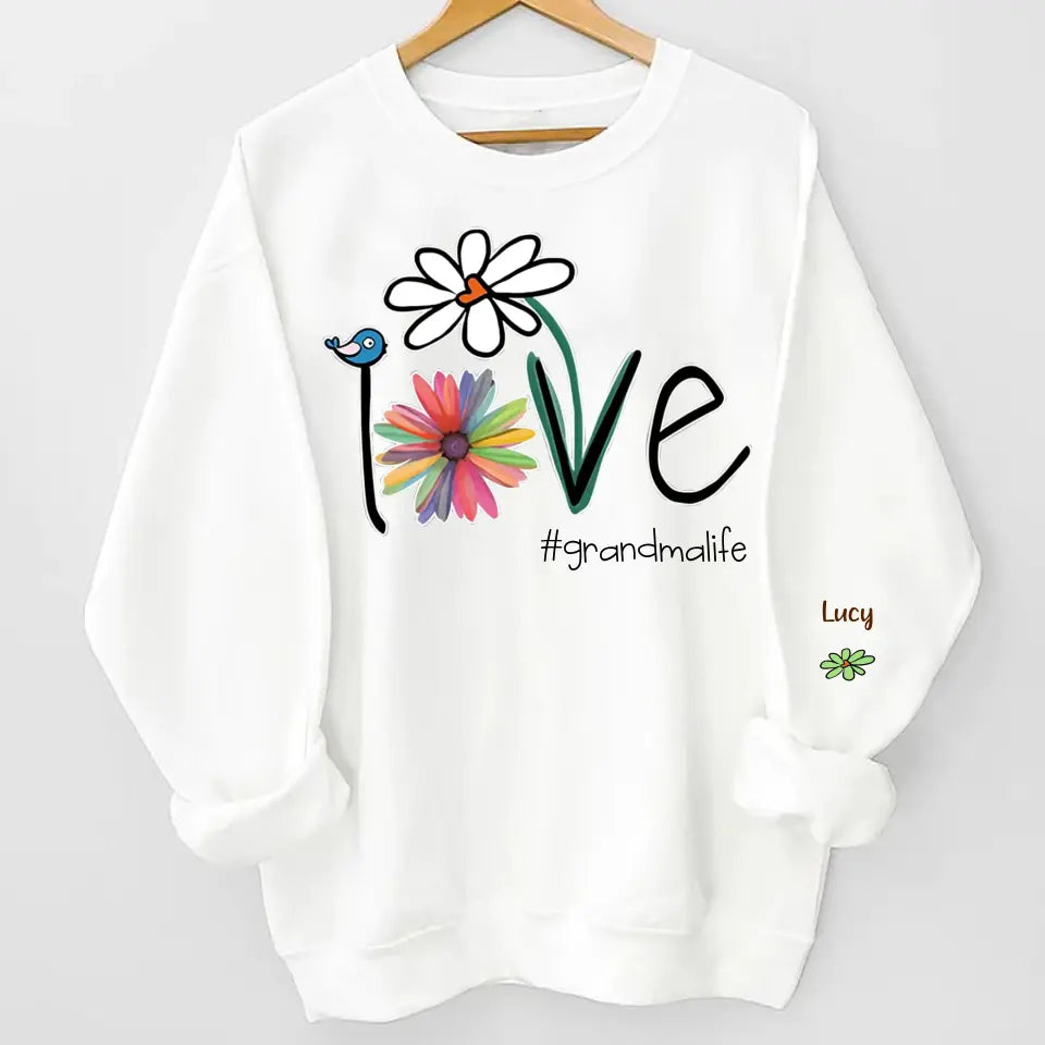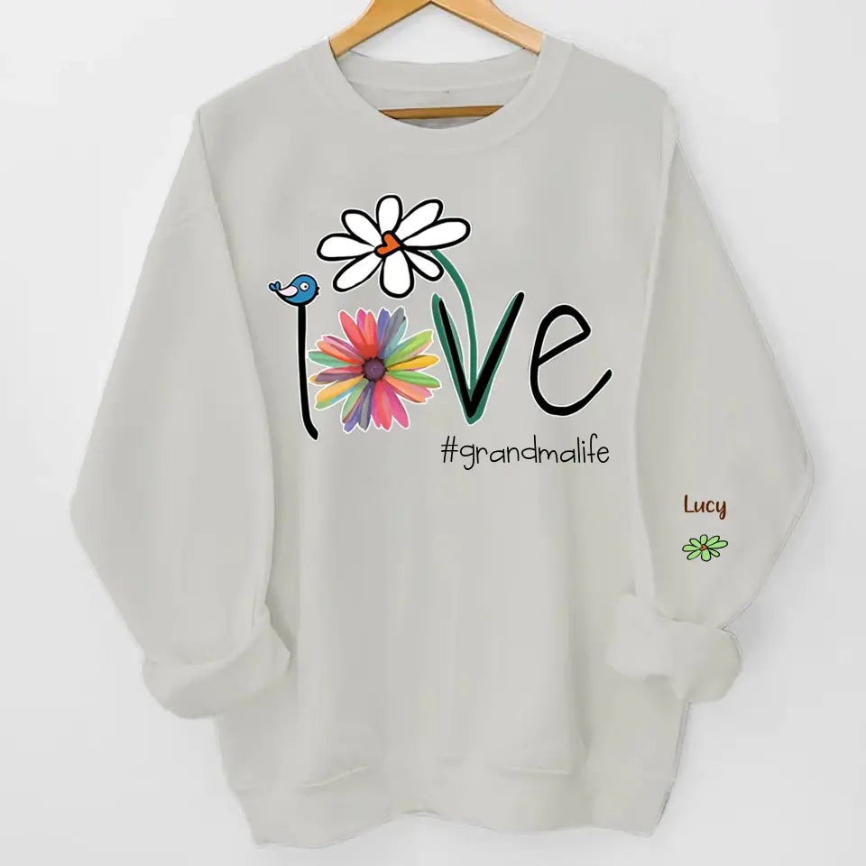 Love Grandma Life Flower Personalized Sweatshirt with Custom Design on Sleeve, GIft For Mom, Grandma