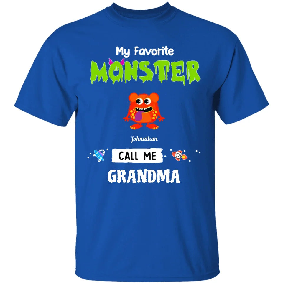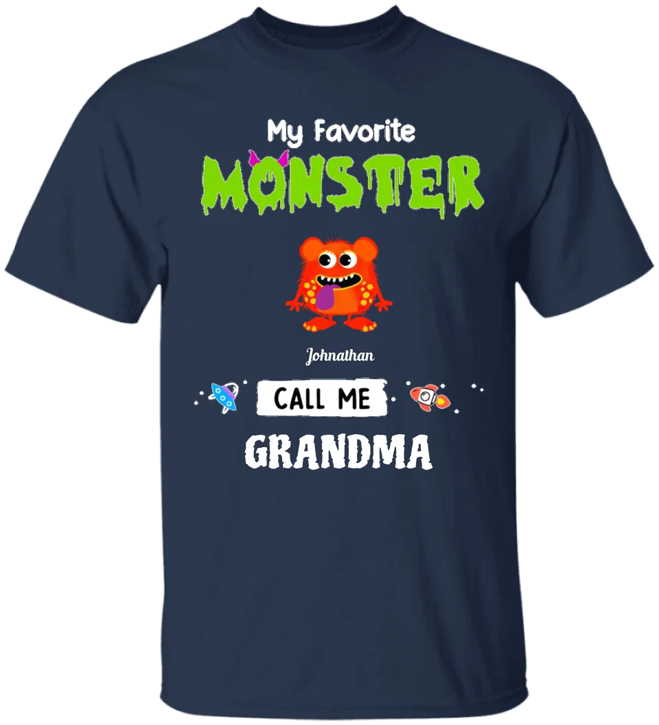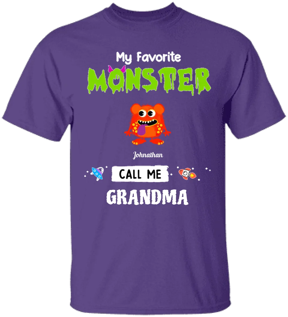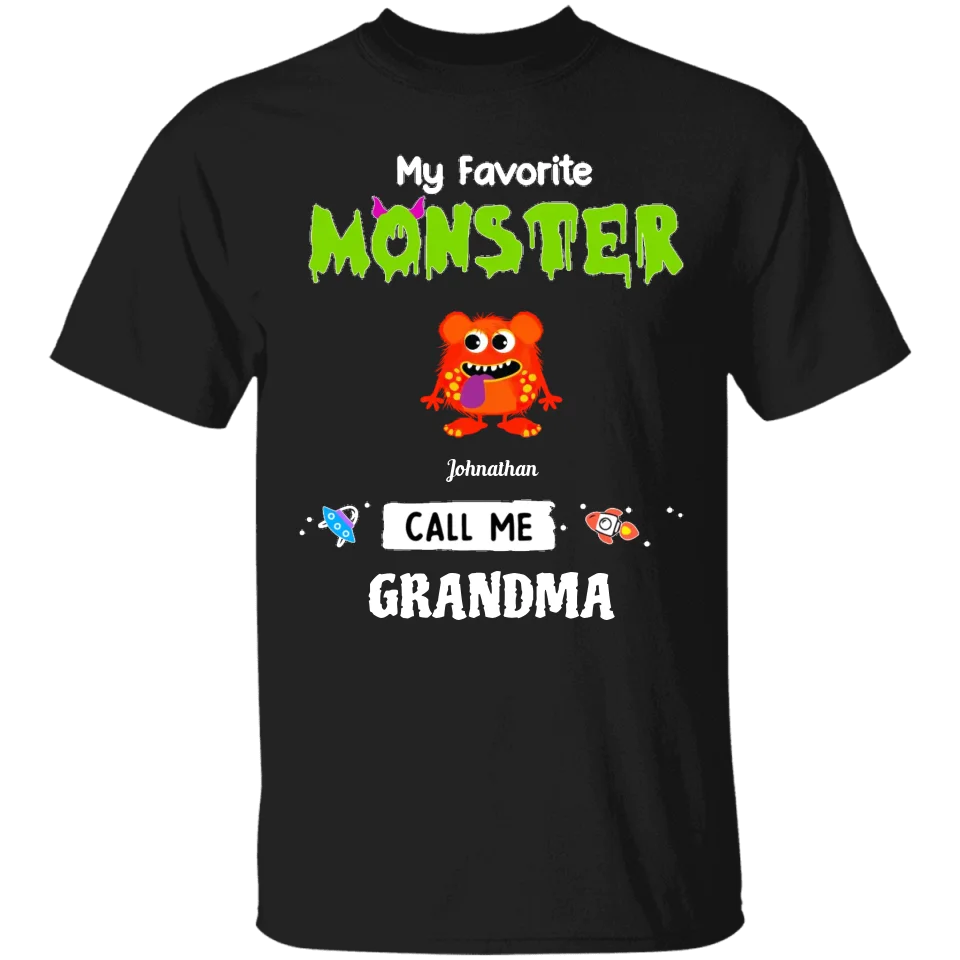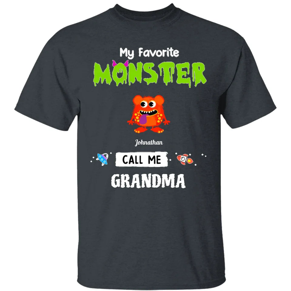 My Favorite Little Monsters Call Me Grandma Personalized Custom Shirt - Halloween Gift for Grandma/Nana/Mimi, Mom, Wife, Grandparent. With a custom name for your grandson, it's the perfect gift for family members who want to show their love and support. Show off your pride with this unique, one-of-a-kind shirt.