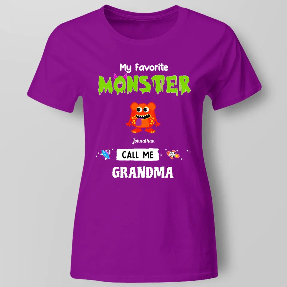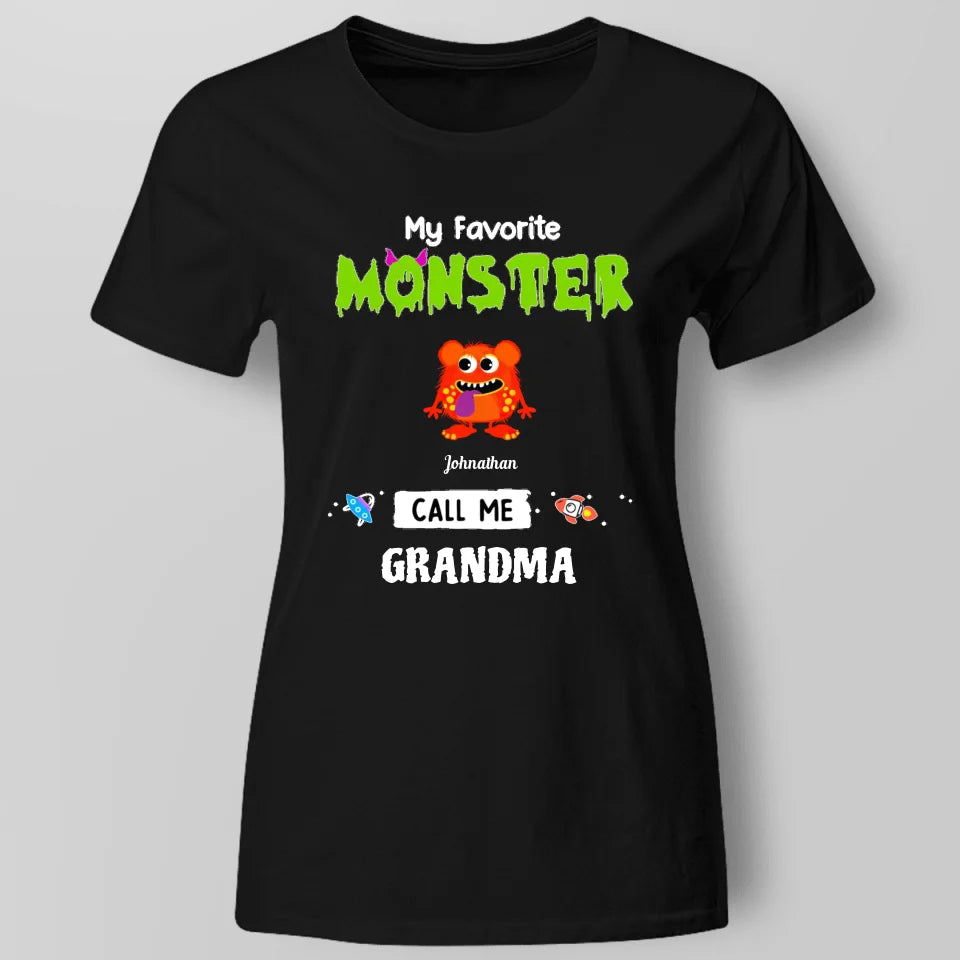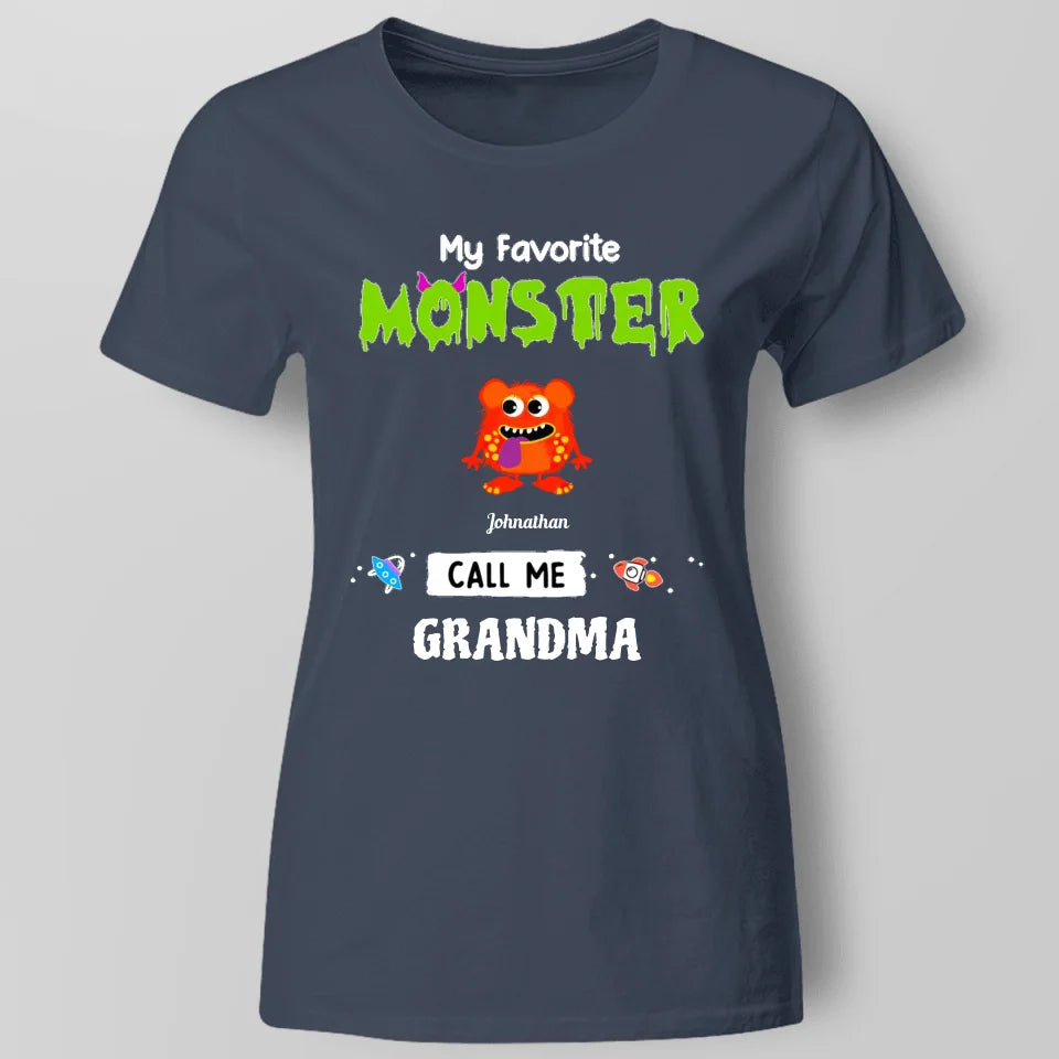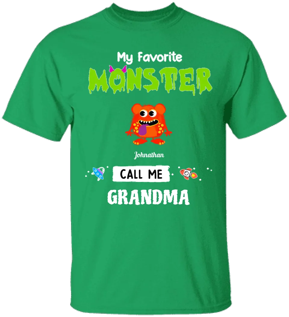 My Favorite Little Monsters Call Me Grandma Personalized Custom Shirt - Halloween Gift for Grandma/Nana/Mimi, Mom, Wife, Grandparent. With a custom name for your grandson, it's the perfect gift for family members who want to show their love and support. Show off your pride with this unique, one-of-a-kind shirt.