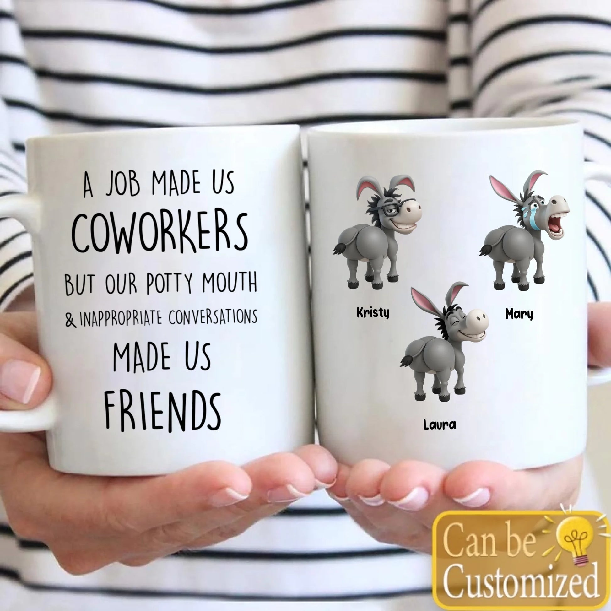 Start your workday with a laugh. This personalized coffee mug features a witty "coworkers to friends" quote with custom name personalization, perfect for celebrating those office relationships that go beyond the job. The humorous potty mouth conversation design brings personality to your desk while keeping your coffee hot. Ideal for work besties, colleagues, and anyone who appreciates candid workplace humor. A thoughtful gift that transforms ordinary coffee breaks into moments of shared laughter and camaraderie.