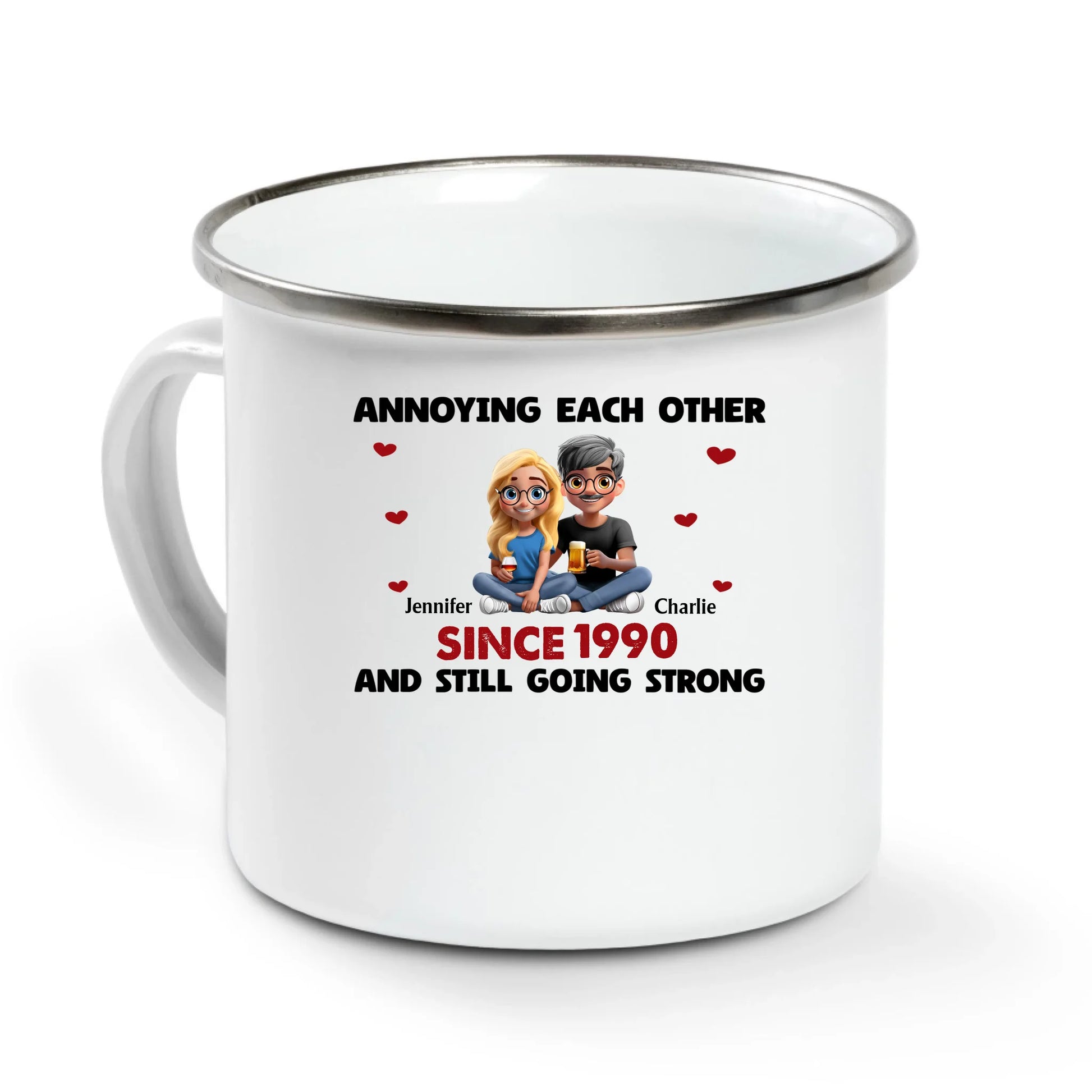 Celebrate your unique bond with this Personalized Couples Mug, featuring the playful phrase "Annoying Each Other Since [Year]" alongside custom names. Crafted from durable ceramic, this coffee cup offers a charming and practical gift that highlights your shared history with humor. Perfect for daily use, it adds a personal touch to morning routines while