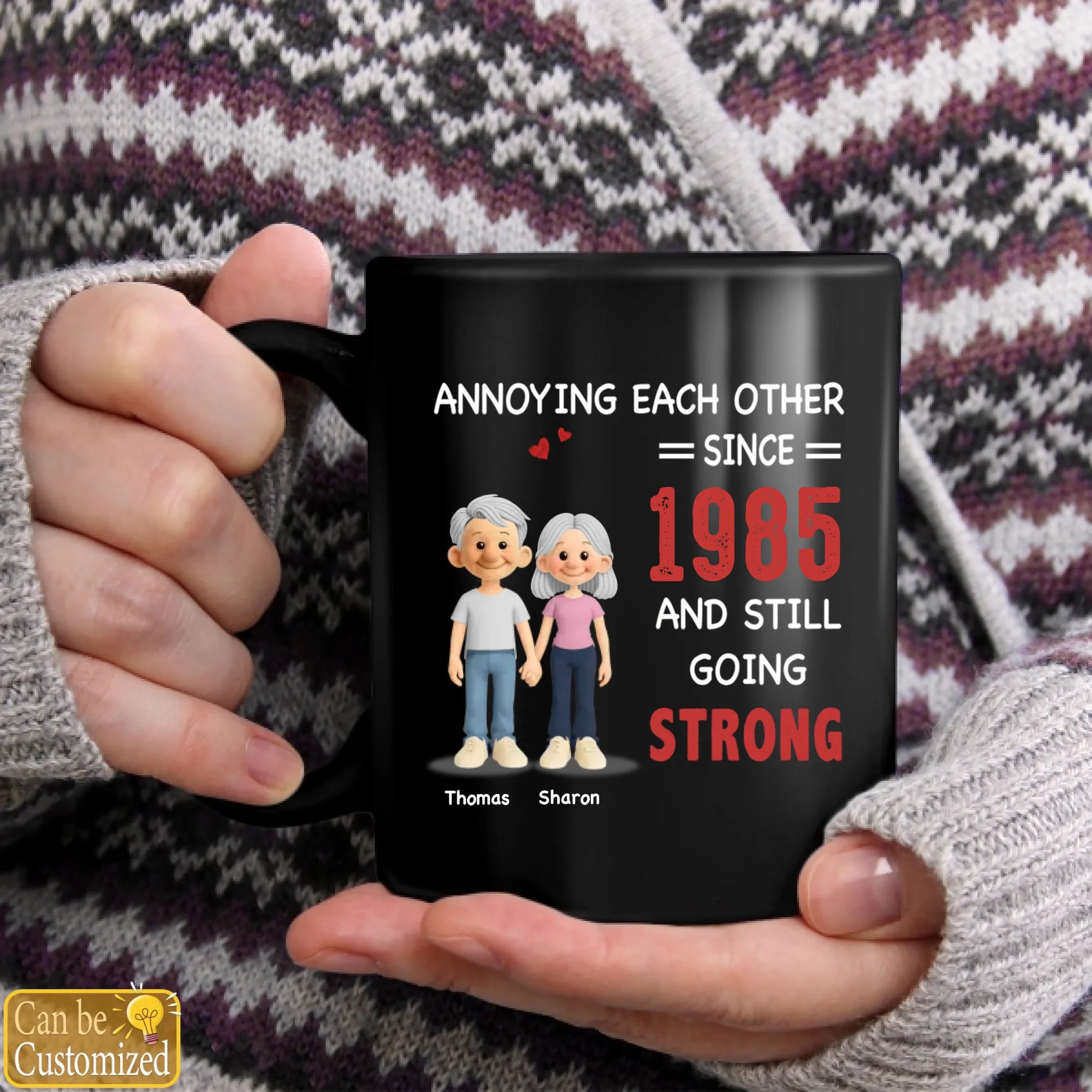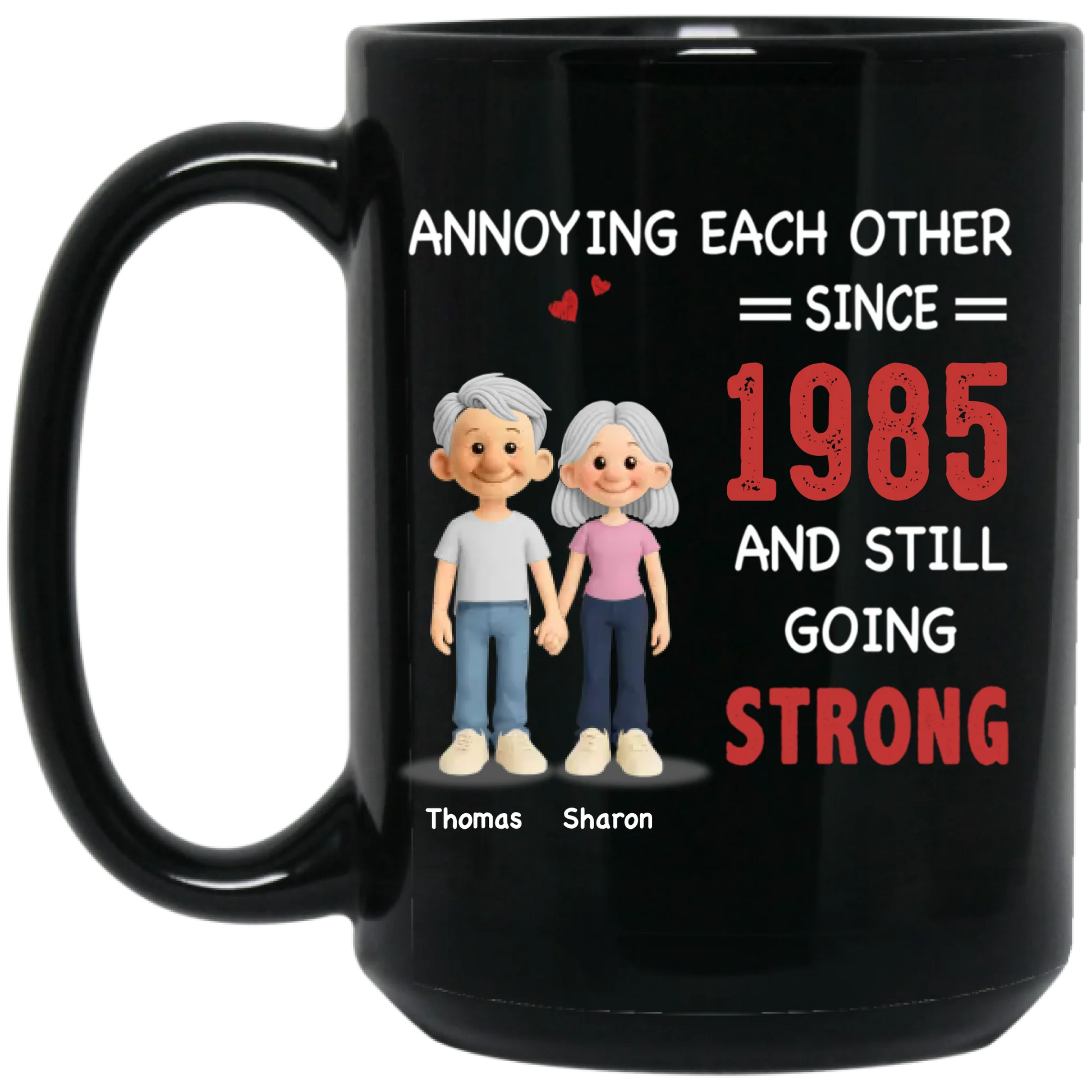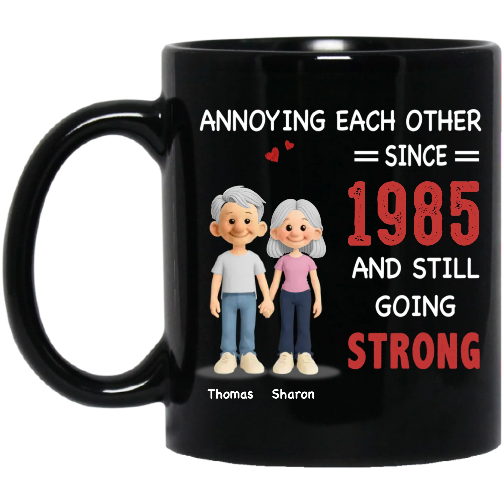 This personalized couples mug features the funny quote “Annoying Each Other Still Going Strong” with a cute cartoon design, making it a perfect gift for couples who love humor. Ideal for Valentine’s Day, anniversaries, or everyday use, this custom mug adds a personal and playful touch to morning coffee or tea.