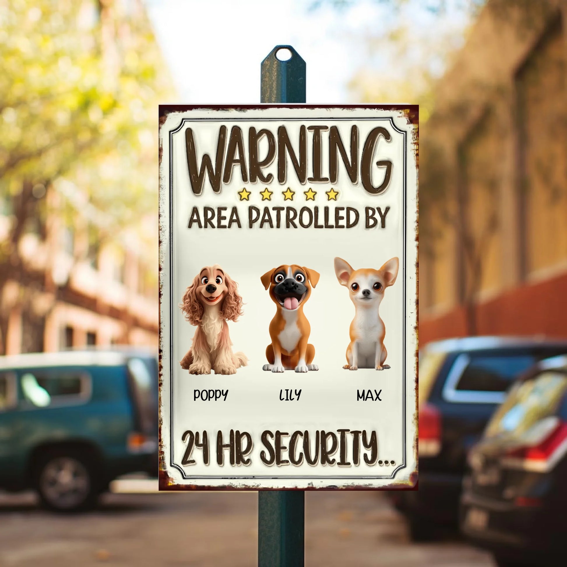 Personalized Dog Warning Sign – 24hr Security Patrol Metal Sign Gift for Dog Owners & Lovers