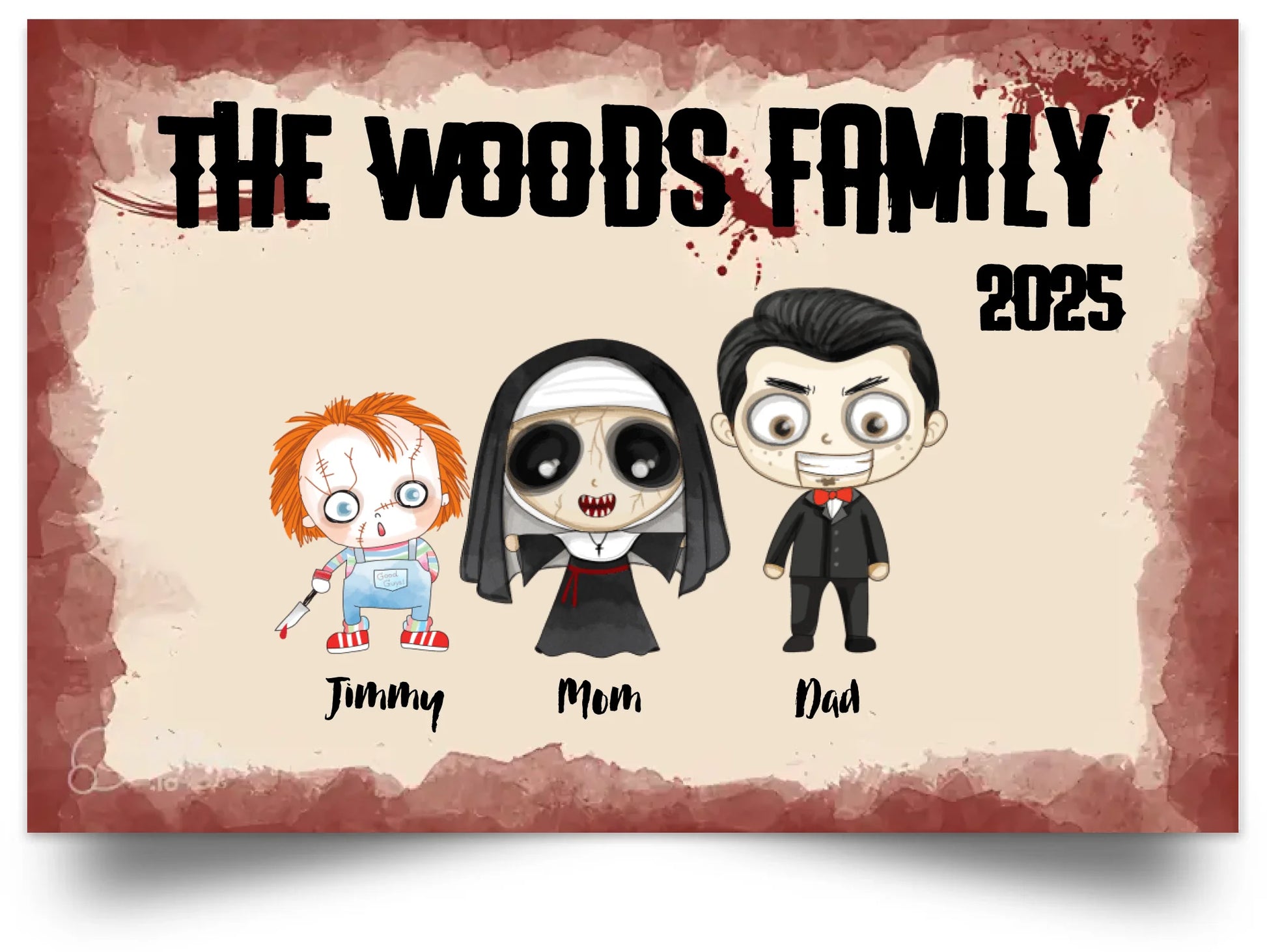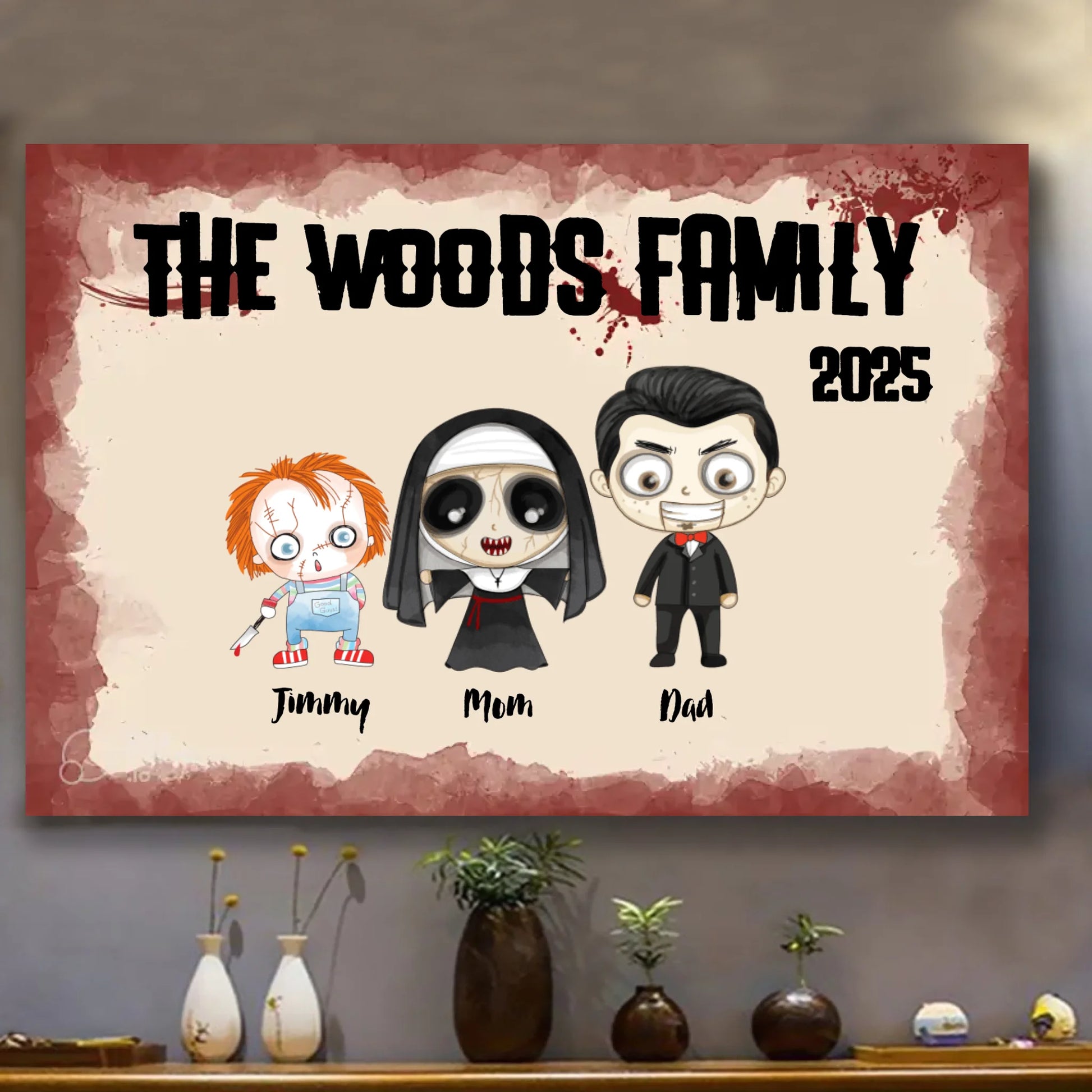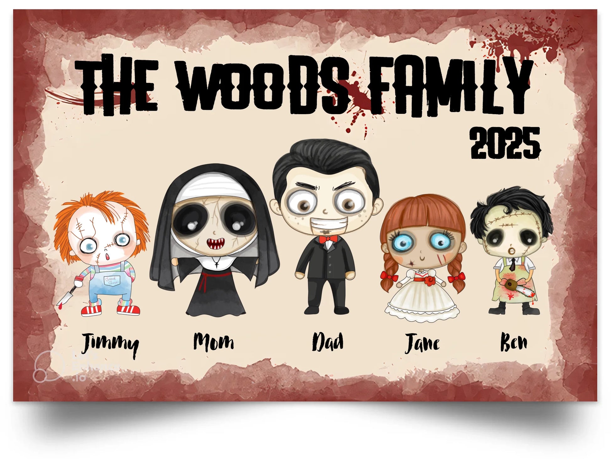 Celebrate Halloween with a unique twist by customizing your own Horror Movie Family Canvas Poster. Featuring personalized names and fun, spooky quotes, this canvas adds a playful yet eerie touch to your home décor. Printed on high-quality material, it makes an exceptional gift that captures the spirit of the season while showcasing your family's personality with a horror-themed flair. Perfect for Halloween enthusiasts seeking a creative and memorable keepsake.