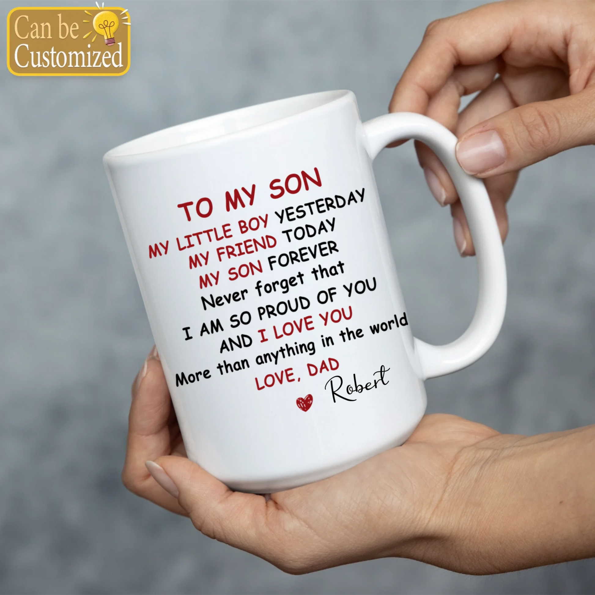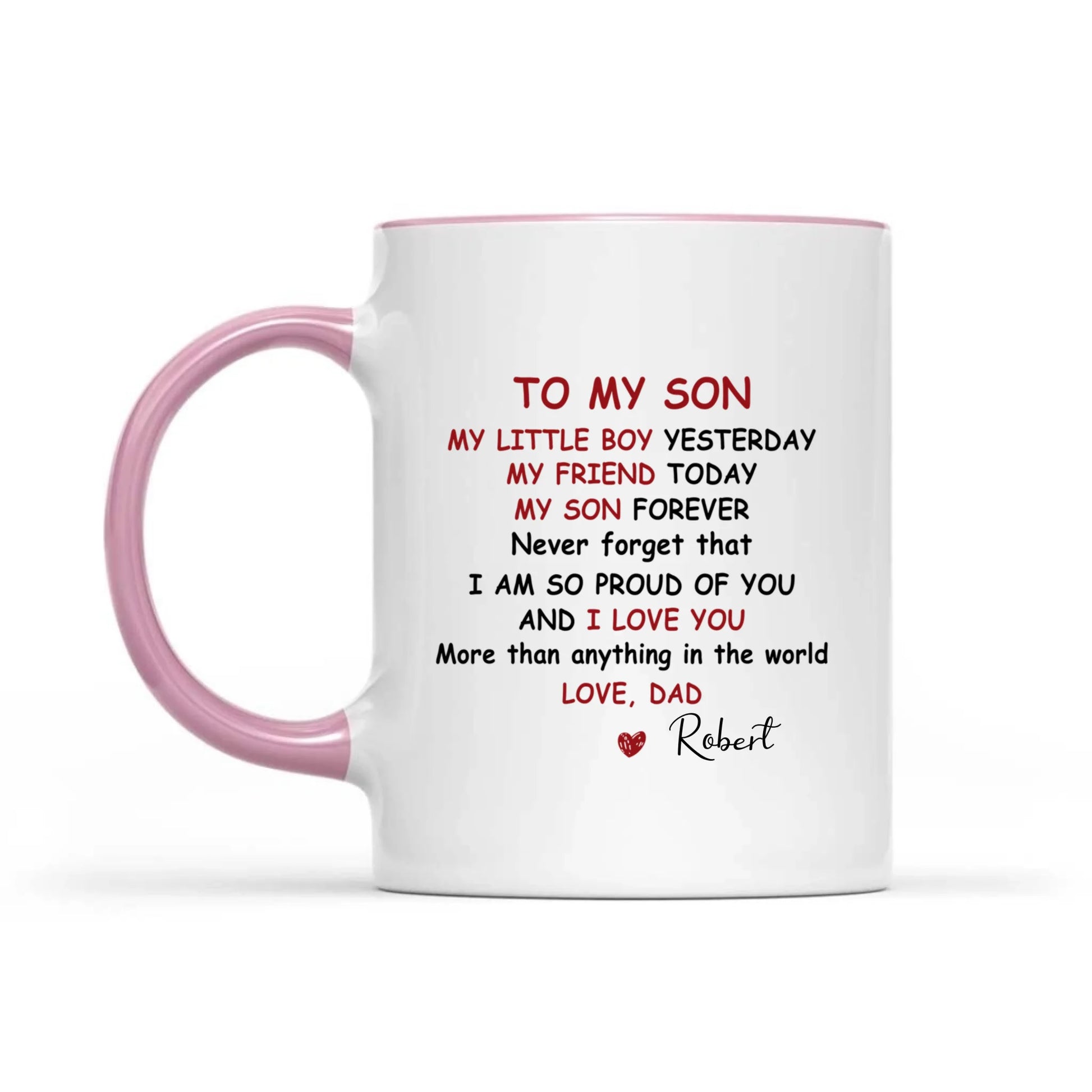 A heartfelt gift that speaks volumes every morning. This personalized coffee mug features a touching message reminding your son of your pride and support, customized with his name for an extra personal touch. Crafted from durable ceramic, it's perfect for daily use—whether he's starting his day with coffee, tea, or his favorite beverage. The high-quality print resists fading, ensuring the meaningful message stays vibrant through countless washes. An ideal keepsake from dad that combines practicality with genuine sentiment, making it a gift he'll treasure and use regularly.
