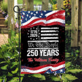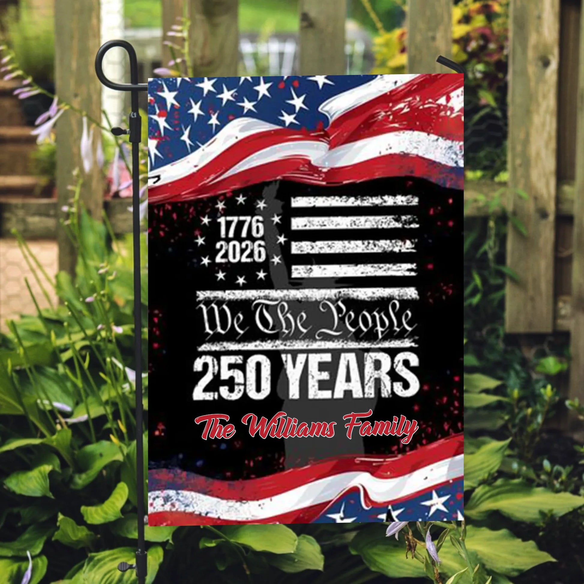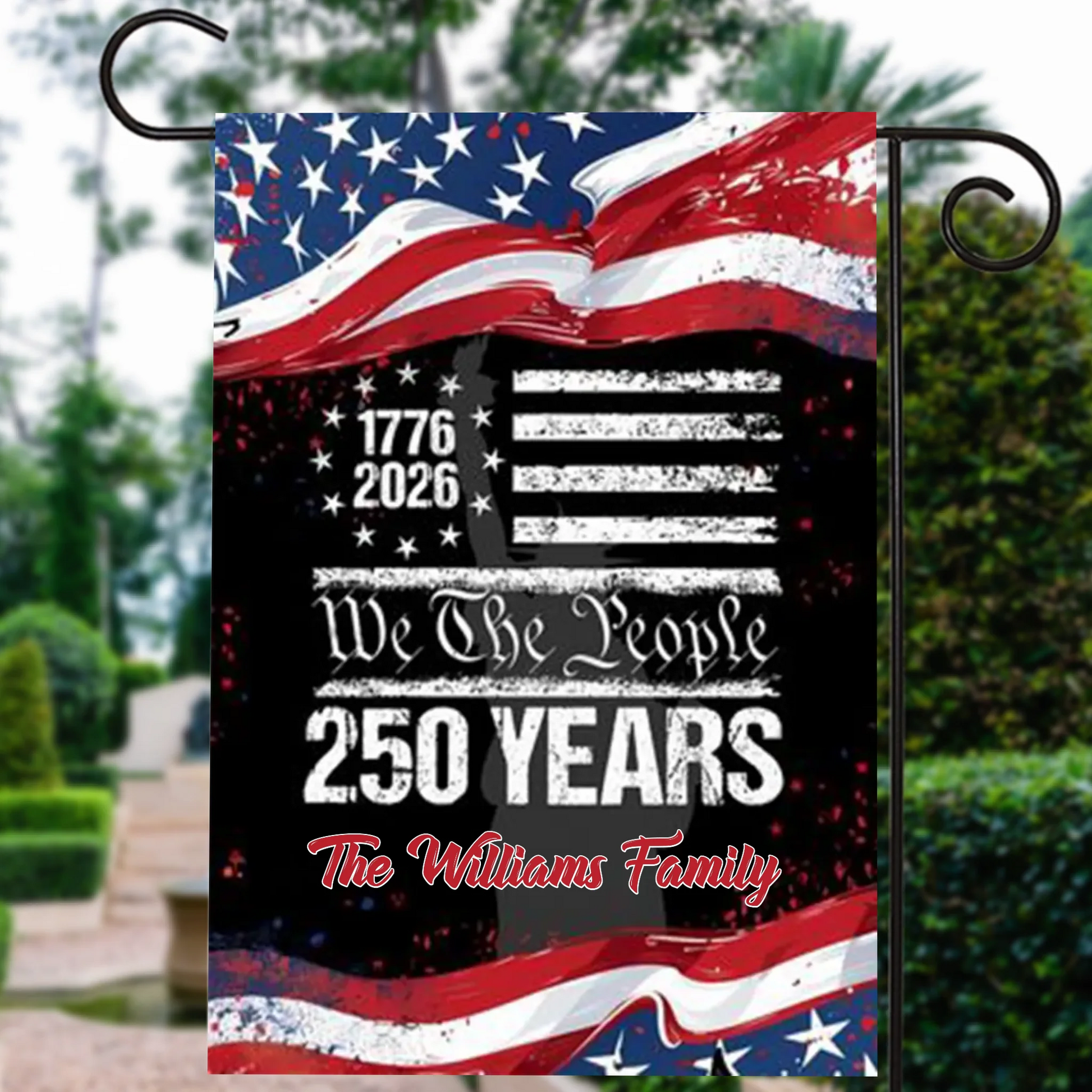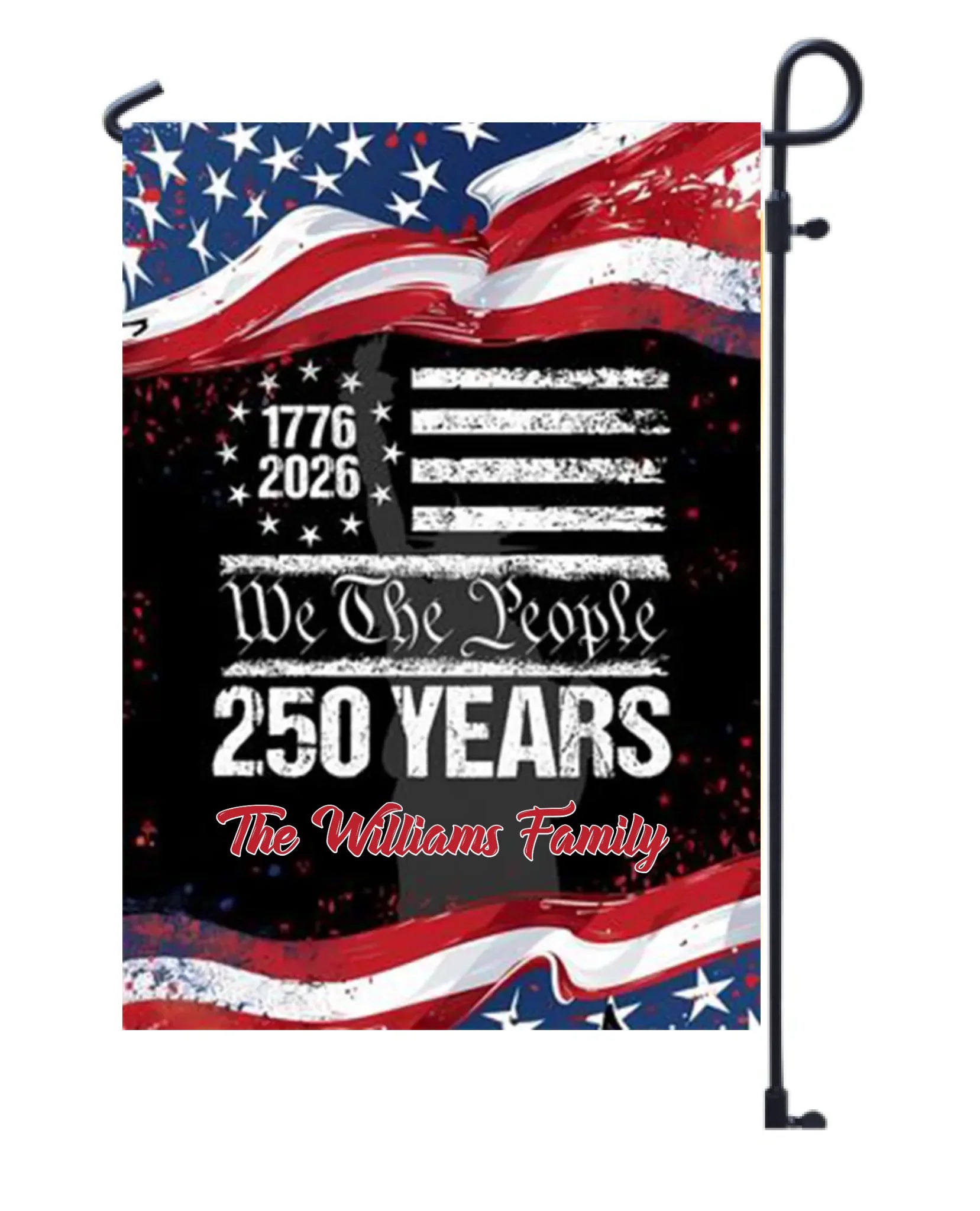 Celebrate America's 250th anniversary with this distinguished garden flag featuring a majestic eagle and your family name personalized in elegant lettering. Commemorating 1776–2026, this patriotic display piece combines timeless symbolism with custom personalization, making it a meaningful tribute to national heritage. Crafted for outdoor durability, the flag withstands seasonal weather while maintaining vibrant colors. Perfect for front yards, patios, or gardens, it serves as both a decorative statement and a heartfelt keepsake marking this historic milestone. An ideal gift for patriotic families seeking to honor American tradition with personal significance.