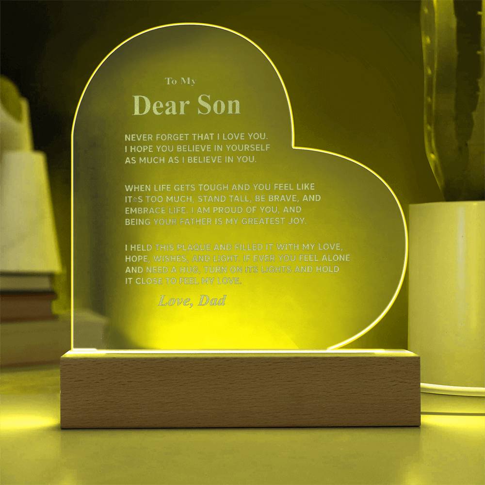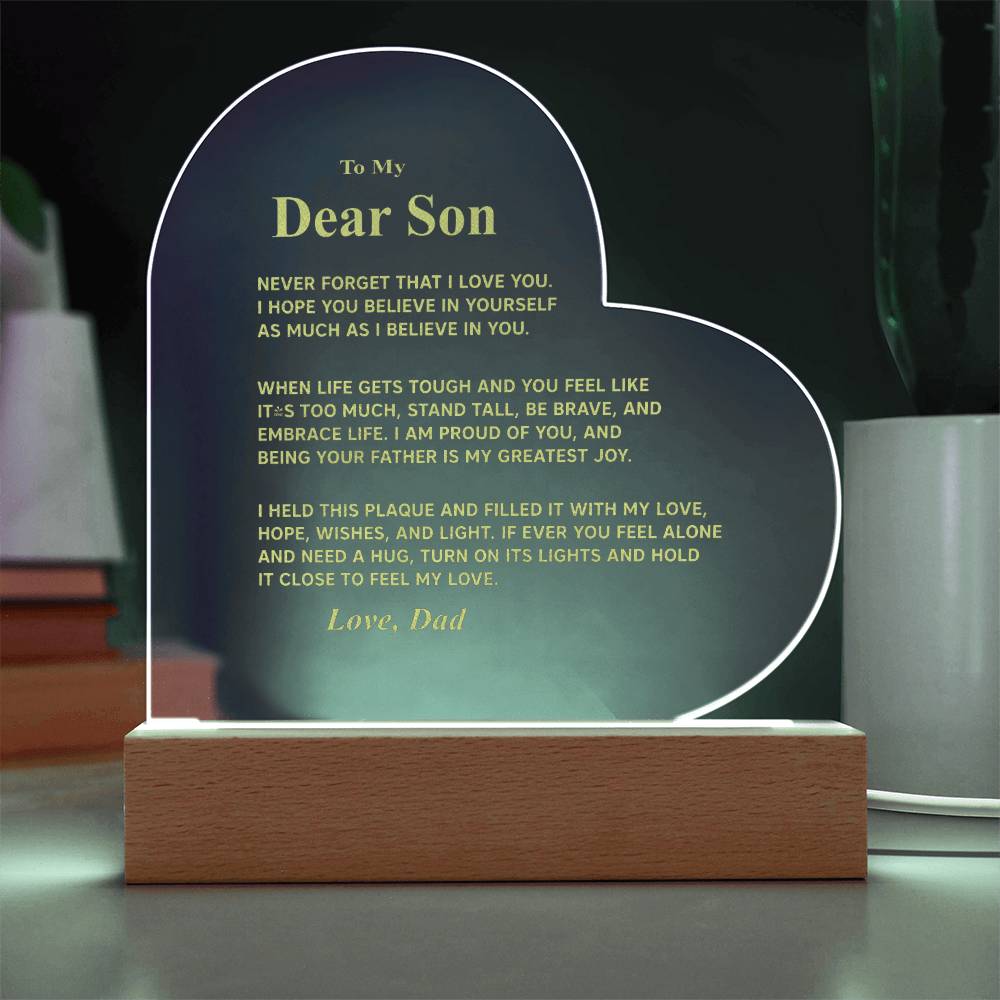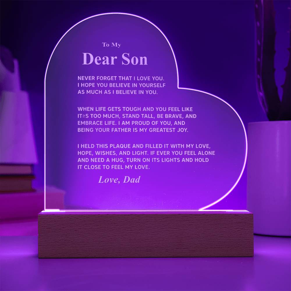 Son Acrylic Plaque Gift From Dad - To My Dear Son - Never Forget that I Love You Led Engraved Acrylic Heart Plaque. Introducing our Engraved Acrylic Plaque – the perfect centerpiece for any room! This design is made on crystal-clear premium acrylic and features a stunning engraved design. This is the ideal present for your beloved partner, family members, or dear friends on special occasions like anniversaries, birthdays, or any occasion where you want to express your love and appreciation in an unforgettable way. Let your loved ones know how much they mean to you by purchasing today!