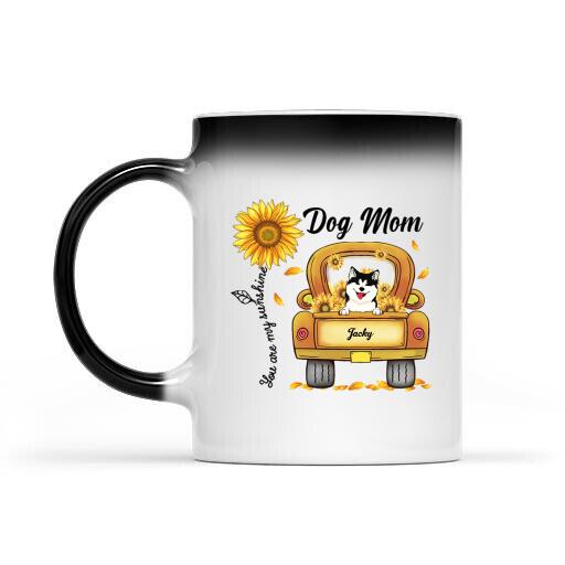 Sunflower Truck Dog Mom Personalized Gift Mug. Grip it and sip it. Personalize an 11oz or 15oz white mug with one of your favorite images. Full color imprinting, strong ceramic construction, and everyday convenience come together in one product.